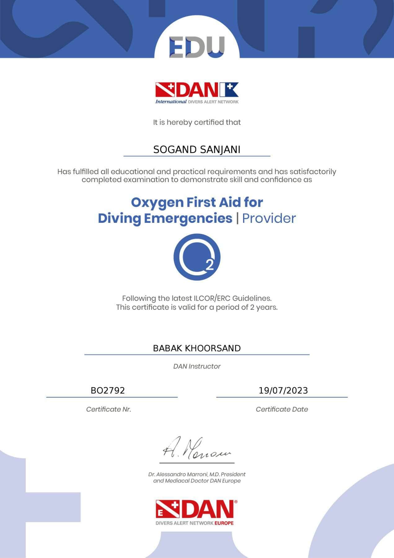 علاقهمندان به دورههای DAN میتوانند کلیه مدارک خود را اعم از کمکهایاولیه پیشرفته، شوکالکتریکی و HMLI را با شرکت در کلاسهای DAN دریافت نمایند.